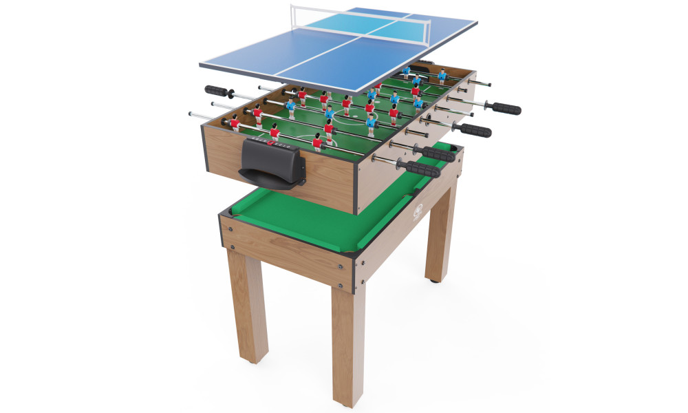 В набор входят: 2 футбольных мячика, 2 теннисные ракетки, 2 мяча для настольного тенниса, комплект бильярдных шаров, треугольник для их выравнивания, 2 кия, щетка для ухода за покрытием и 2 мелка. Всё необходимое для начала игры — уже в комплекте!